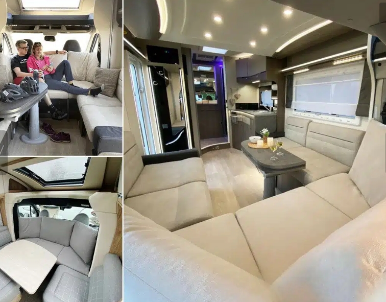 Dans la plupart des camping-cars, les banquettes en L ou face-face sont associées aux sièges pivotants de cabine un salon confortable et convivial. HappyLounge propose d’aller un peu plus loin. Il s’agit d’un jeu de coussins, qui forment une grande assise continue, sur toute la largeur de l’habitacle. Cette assise repose naturellement sur les sièges de cabine, que l’on aura évidemment retournés en position salon. Le dossier de ce sofa est composé de gros coussins. L’ensemble prolonge les deux banquettes d’une dînette face-face pour former un grand salon en U. Le tableau de bord est caché, on quitte assurément l’environnement automobile.
